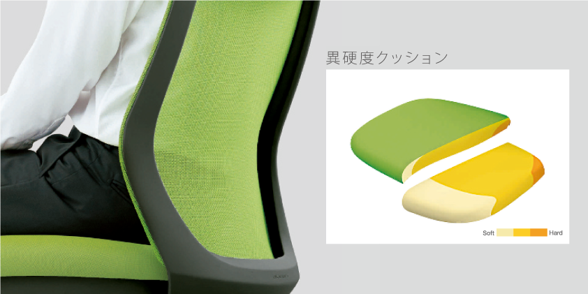 背骨を自然なS字型に保ち、腰への負担を減らす「背もたれ形状」。太ももとお尻の体圧を適切に分散する「異硬度クッション」。バランスのよい姿勢をサポートする、独自の基本性能を搭載しています。