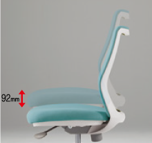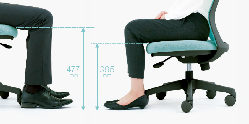 座面下のメカ部を小さくしたことで、座面の高さを最低385㎜まで下げられるようになりました。小柄な人も、かかとを床にしっかりとつけた姿勢で座れます。さまざまな人が使用するオフィスシューティングだからこその気くばりです。