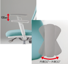 肘パッド部は、上下、角度の調節が可能です。上下は100mm(20mmピッチ・6段階)、角度は60度(内側30度・外側30度)可動します。