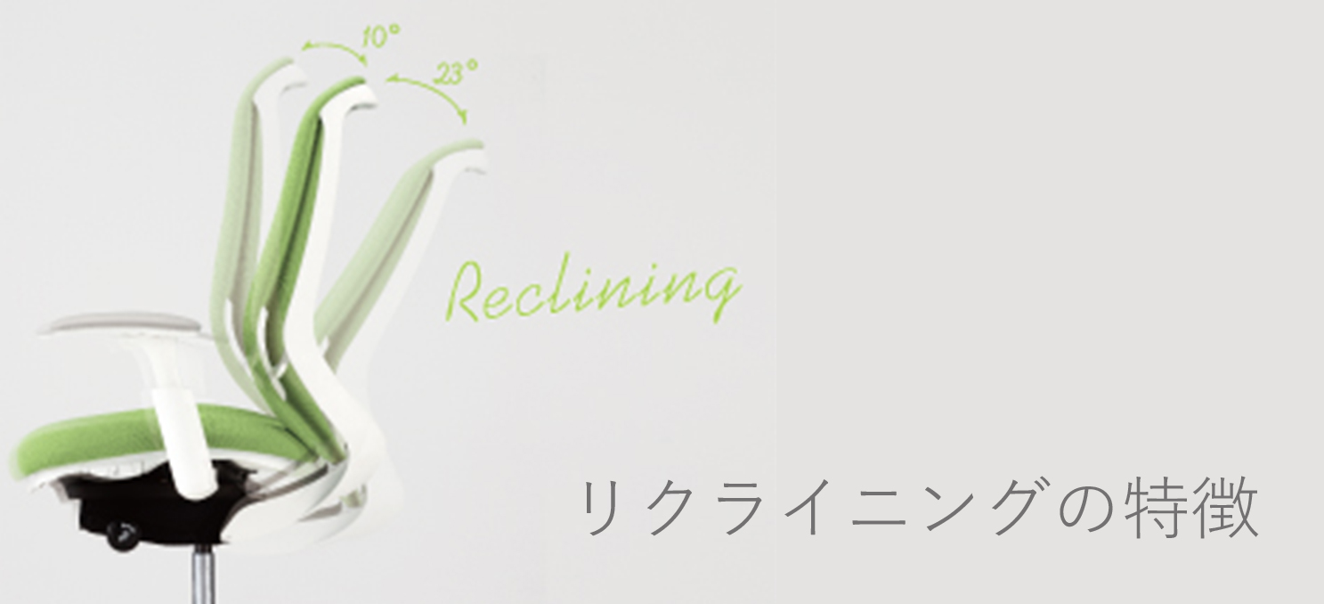 座面左下のダイヤルでリクライニングの固定と解除が行えます。背と座はシンクロしてリクライニングし、従来の直立姿勢から後傾姿勢までのリクライニングに加え、パソコン作業や筆記作業をサポートするように、前傾ポジションをとることが可能です。背のリクライニングの範囲は、直立〜後傾で23°、直立〜前傾で10°です。リクライニングの固定は4段階です。